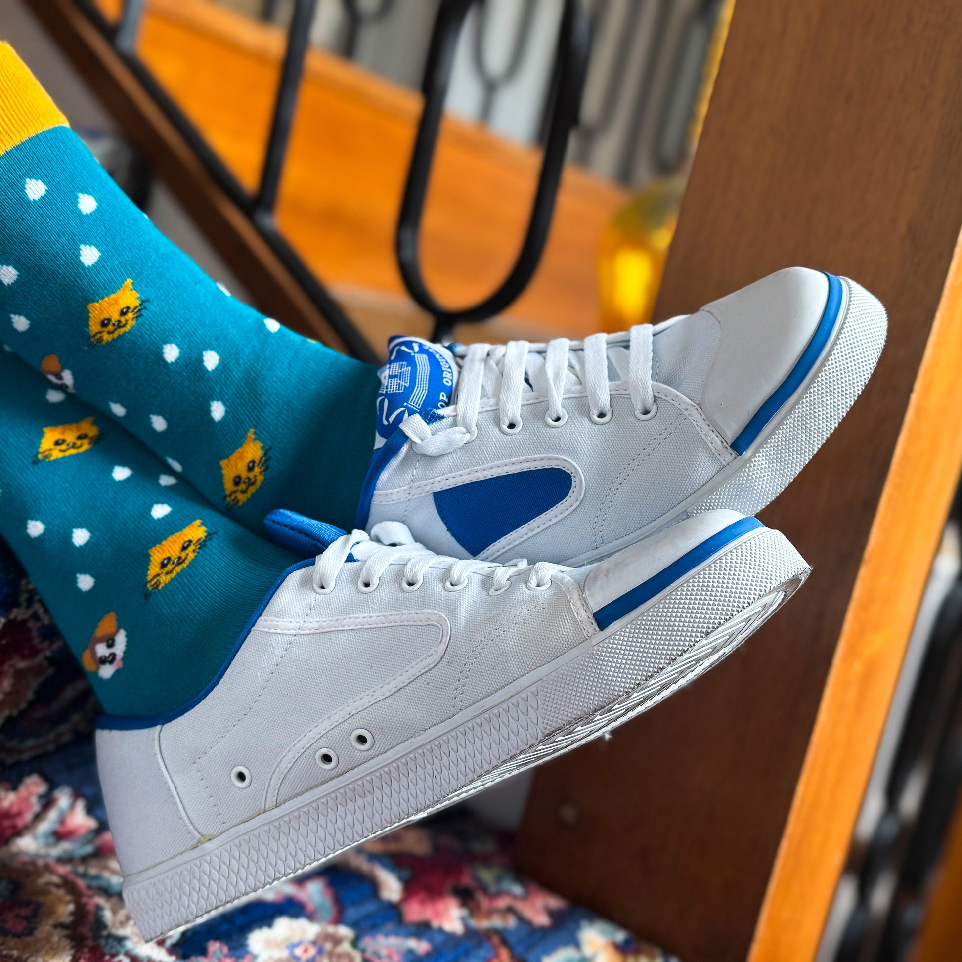 Our men's teal socks feature a whimsical "raining cats and dogs" motif, offering both comfort and a unique design. Crafted from soft, breathable fabric, they provide a snug fit that’s ideal for everyday wear. The playful pattern adds a lighthearted touch to your outfit while keeping your feet comfortable and cool throughout the day.
